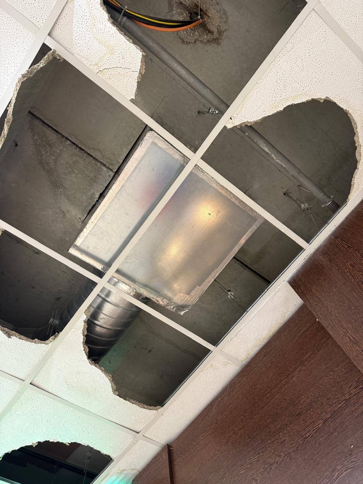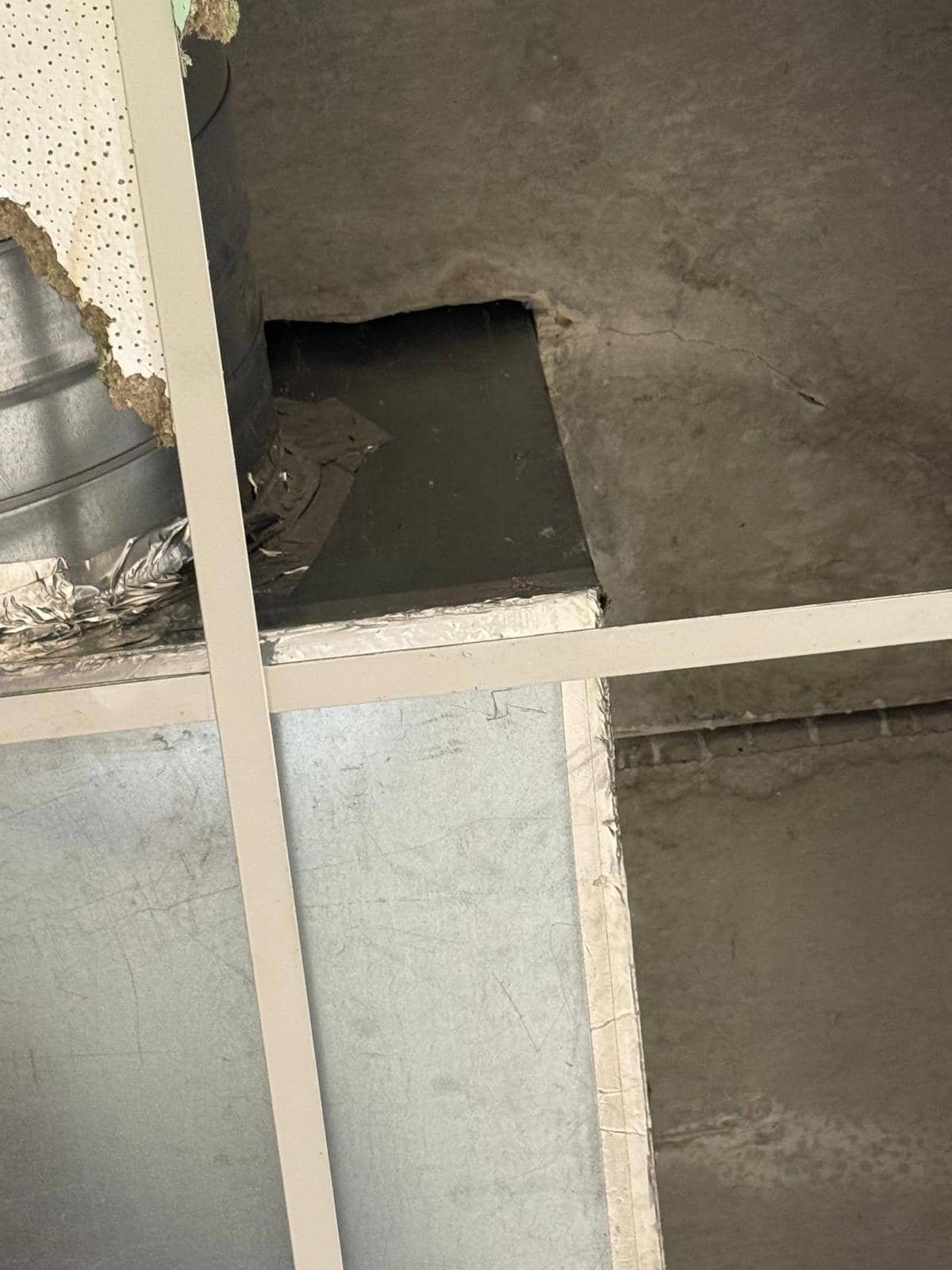 Des désordres visibles, comme la chute de dalles de faux plafond, confirmaient la présence d’infiltrations actives.